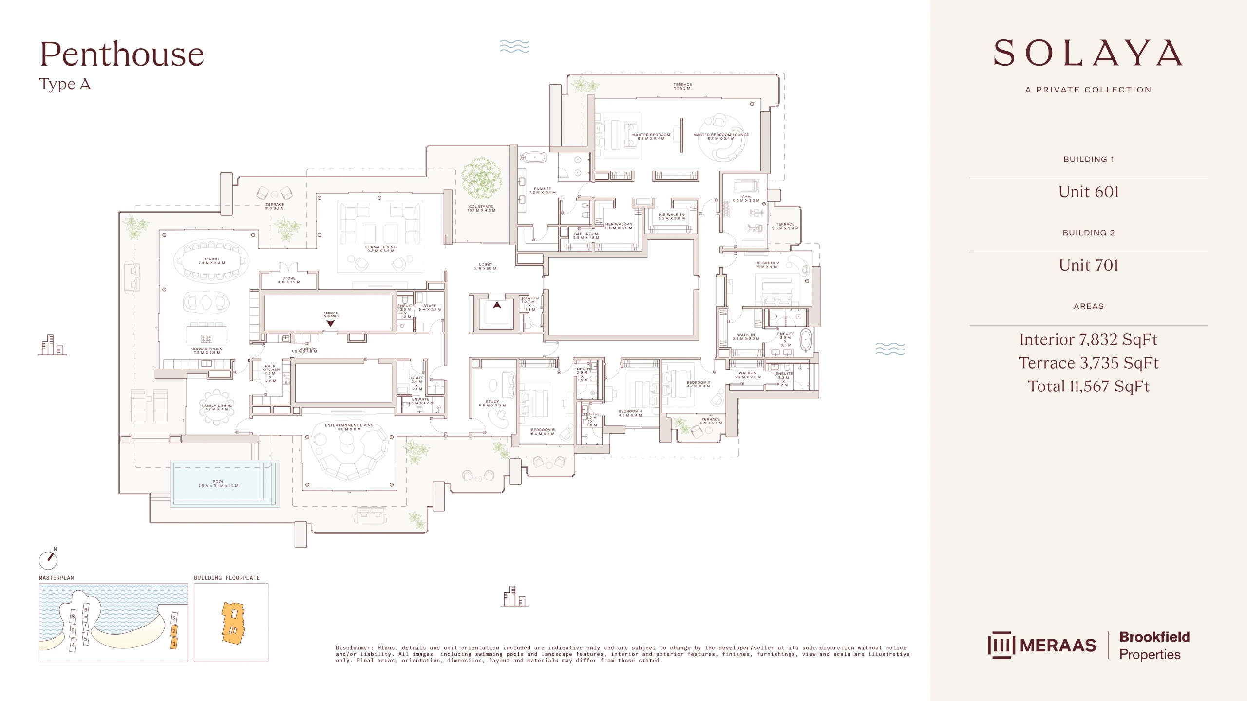 Offering one of the largest layouts in the community, this extraordinary penthouse spans a remarkable 11,567 SqFt, featuring 7,832 SqFt of interior living space complemented by an expansive 3,735 SqFt wraparound terrace. Designed with a focus on openness, natural light, and seamless indoor–outdoor living, this residence delivers a villa-style experience at penthouse elevation — combining privacy, grandeur, and architectural elegance.